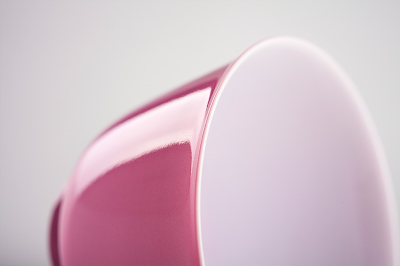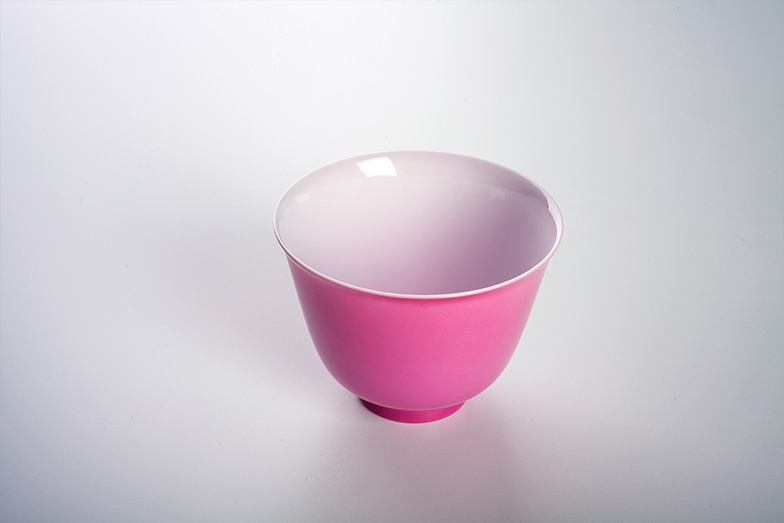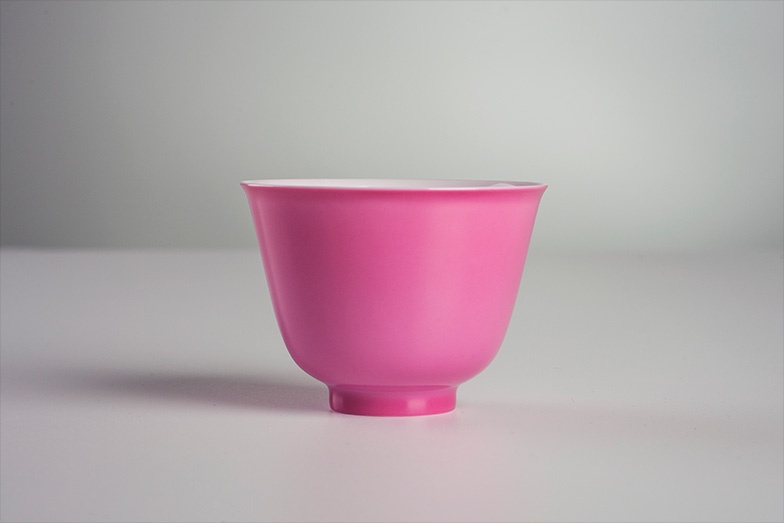 胭脂水釉杯胎体极薄,器里施纯净的白釉,在器物口沿处露出一道白色的边,内外相衬,愈发显出胭脂色的娇艳。胭脂水工艺品质要求很高,成品又少,釉色有名且贵气,往往价格不菲。