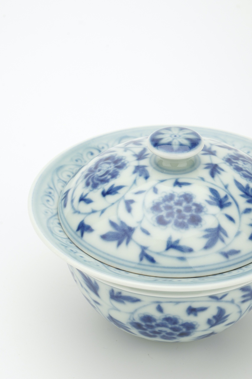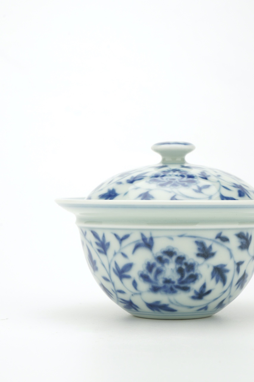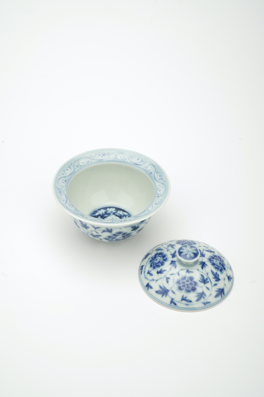 画面采用写实绘法,饰青花缠枝牡丹纹,