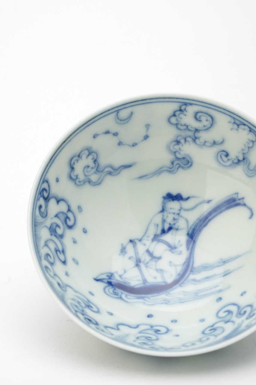 内纹饰取“仙人乘槎”图,浪花滚滚,