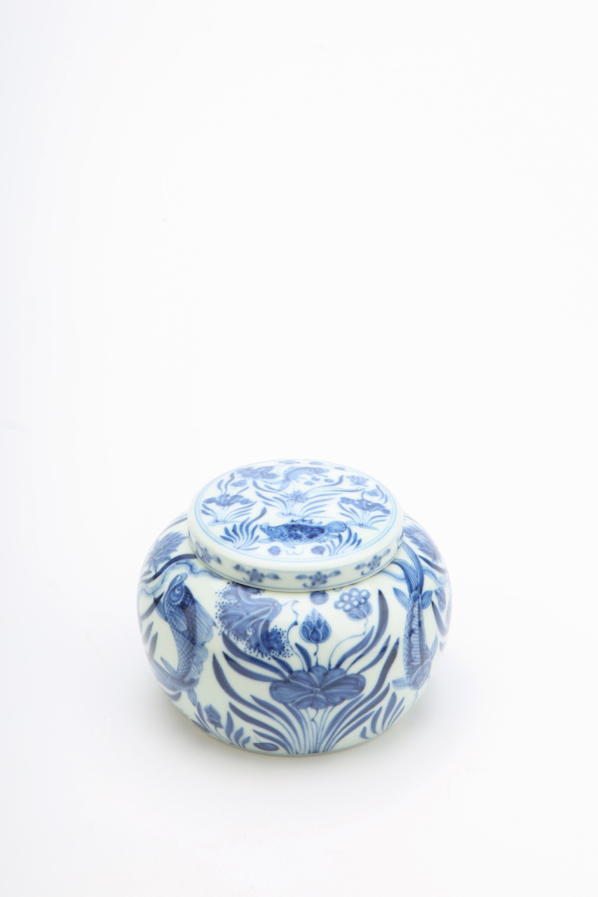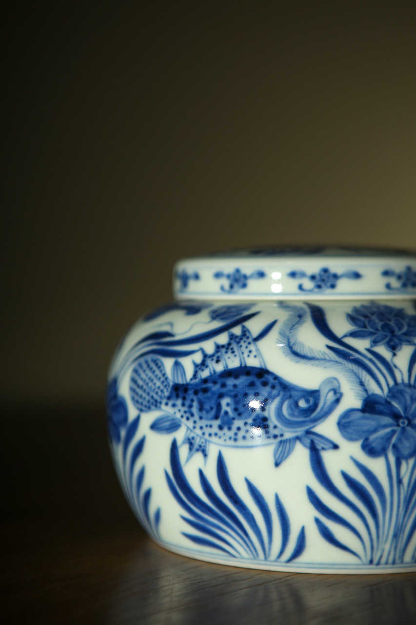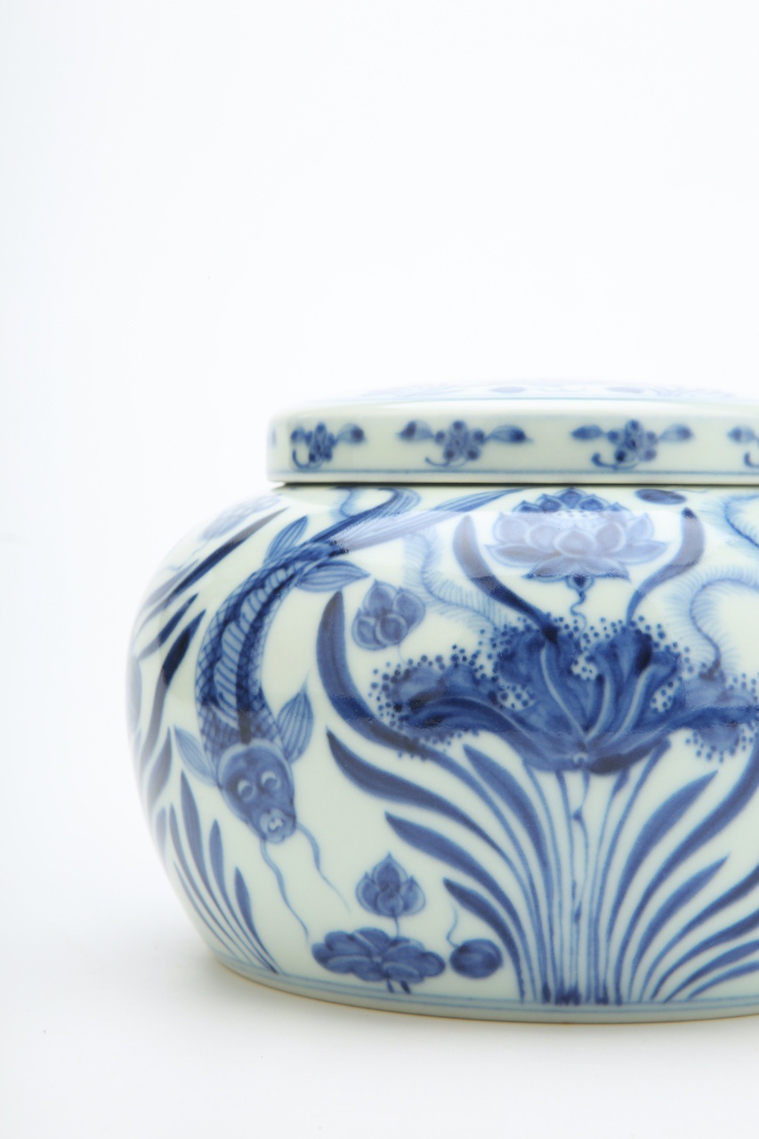 游弋于莲草浮萍间,构成鱼藻纹图案。