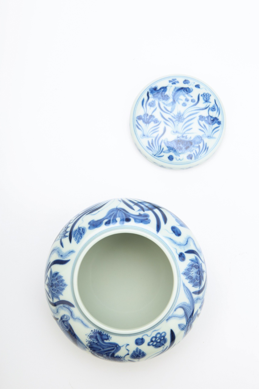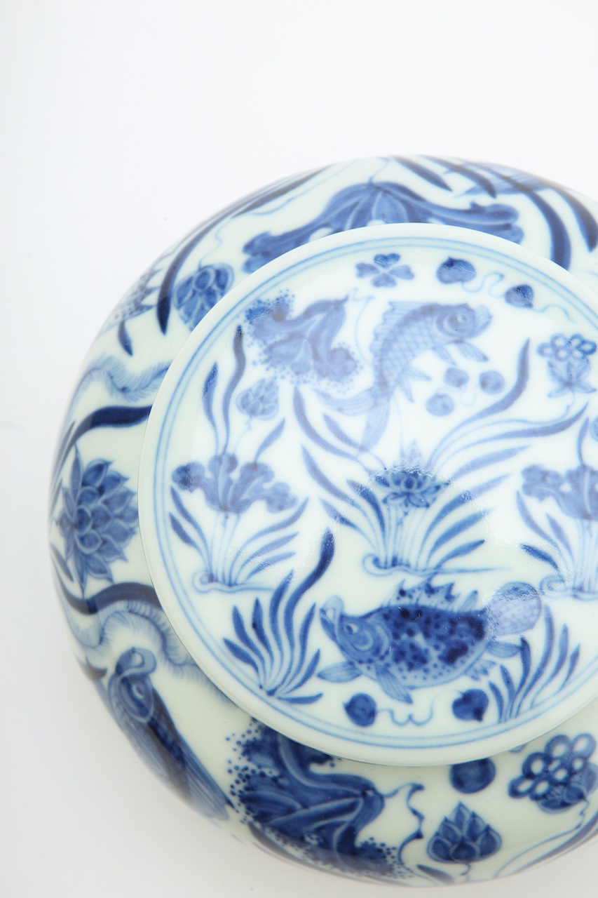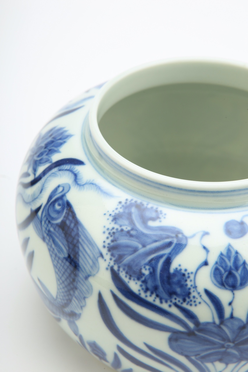 游弋于莲草浮萍间,构成鱼藻纹图案。