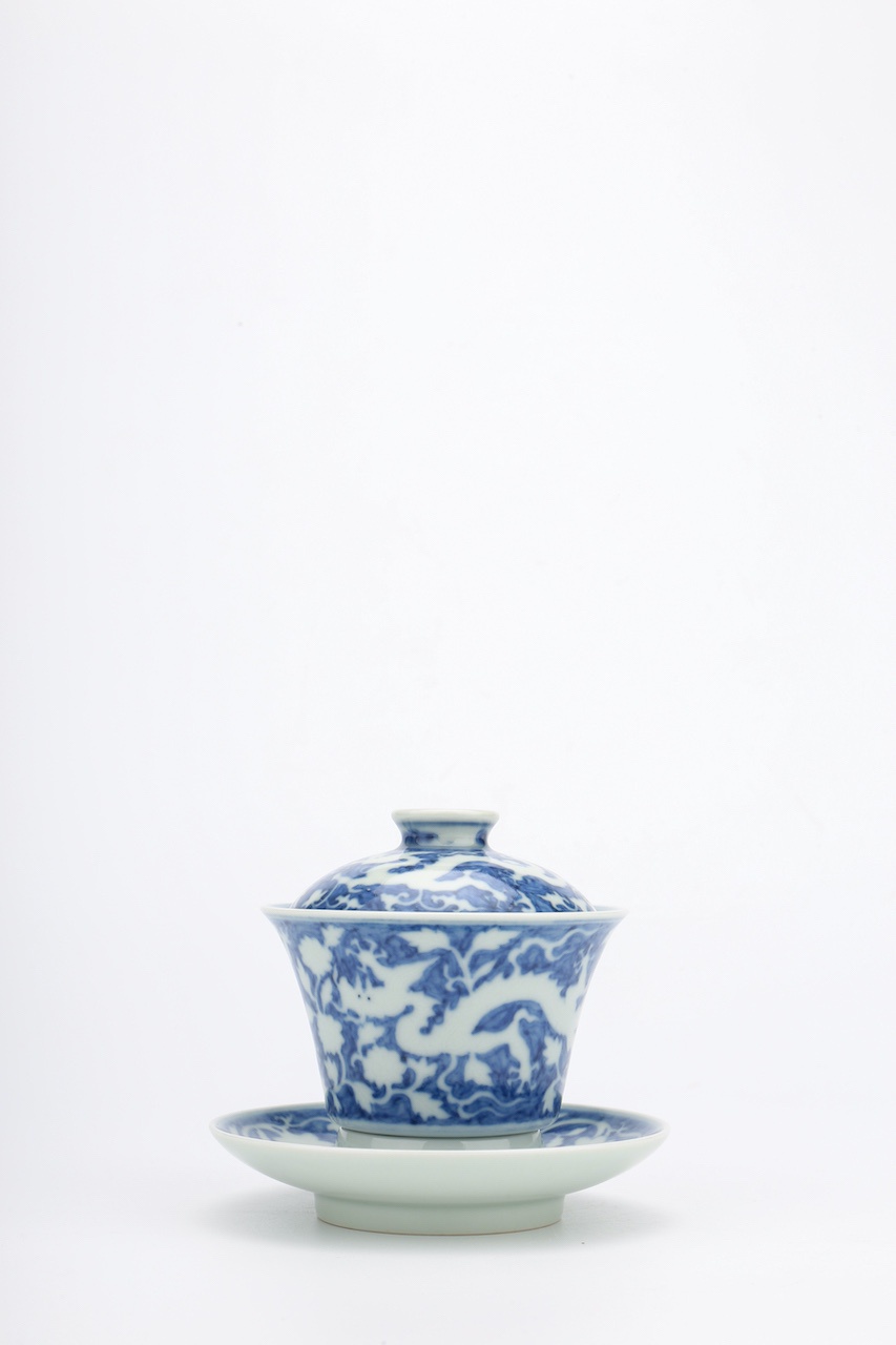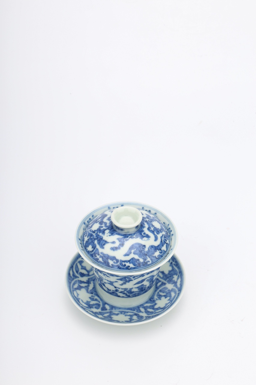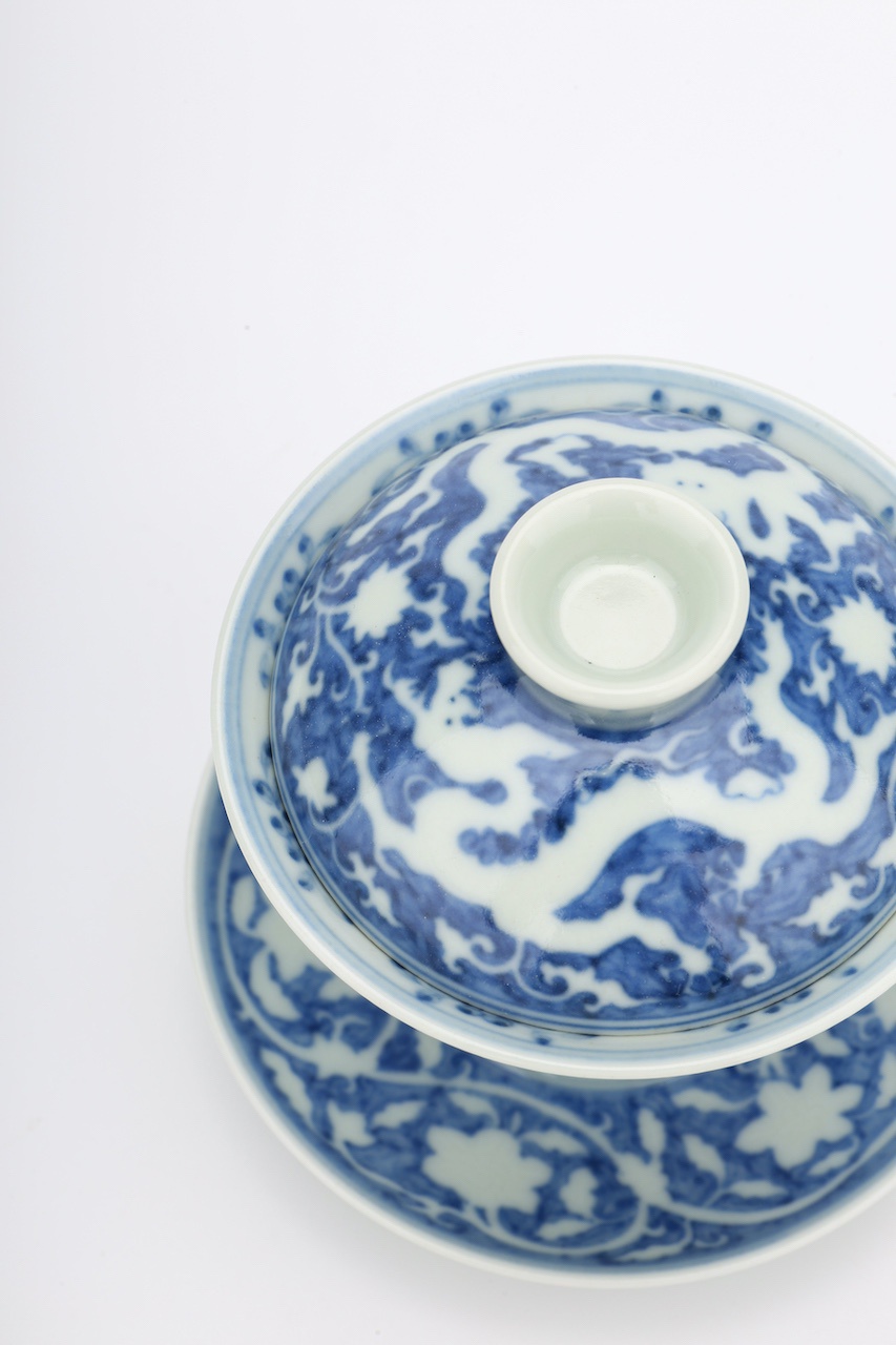整器青花地白龙穿花主题,
